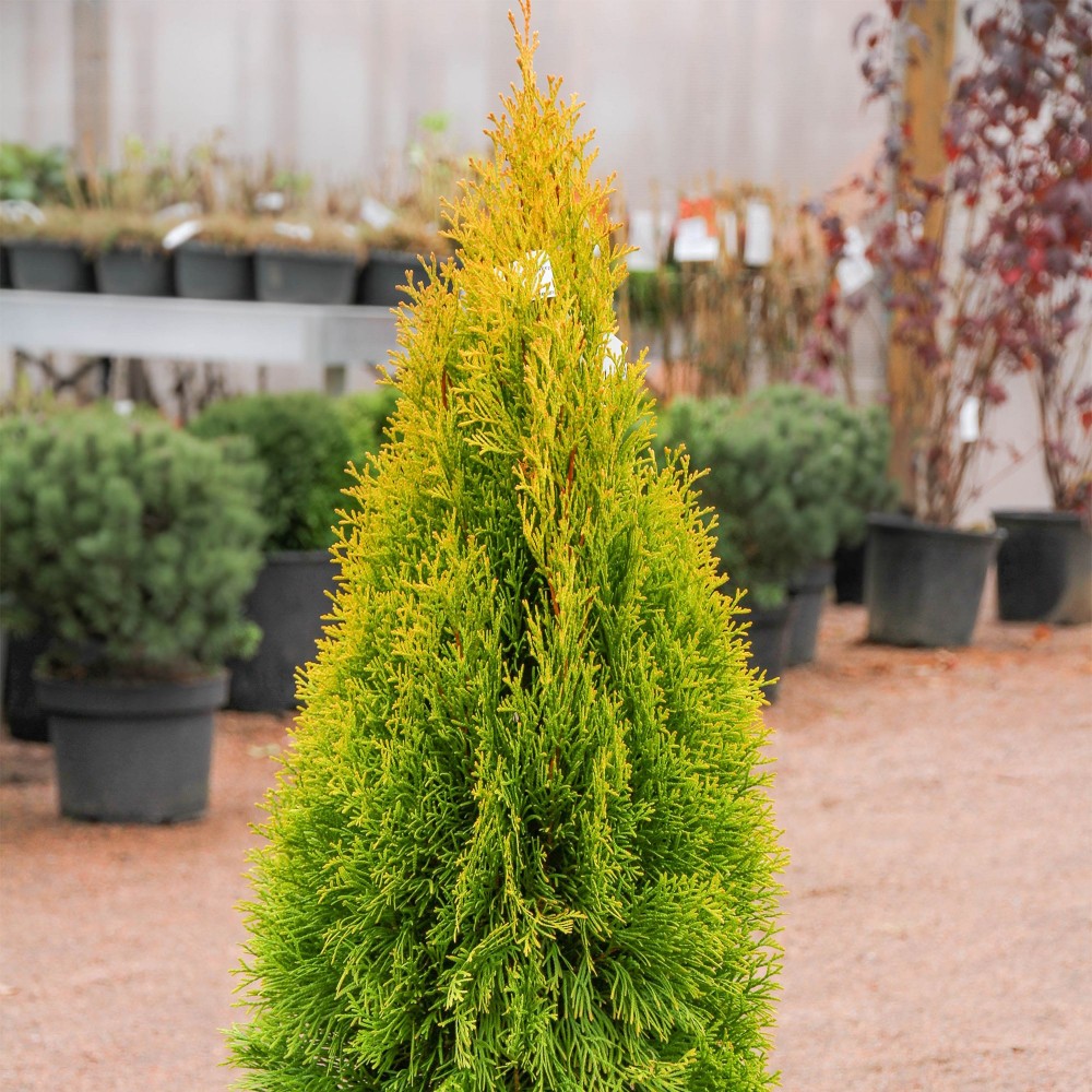 Туя 'Смарагд' – это вечнозелёное декоративное растение, принадлежащее к семейству Кипарисовых. Саженцы размером 20-40 см идеально подходят для создания живых изгородей, а также для одиночных и групповых посадок в саду. Этот сорт отличается конусовидной формой кроны и ярко-зелёными, блестящими иголками, которые сохраняют свой насыщенный цвет круглый год.